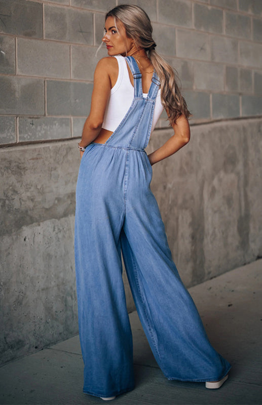 Chic Washed Denim V-Neck Jumpsuit Adjustable Overalls – Trendy & Comfy Must-Have