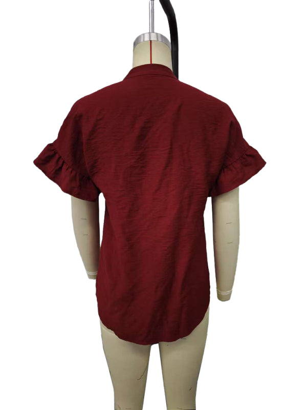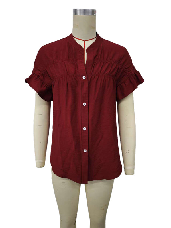 ποΈ Chic Gathered Short Sleeve Shirt Stand Collar Blouse β Casual & Stylish Must-Have β¨