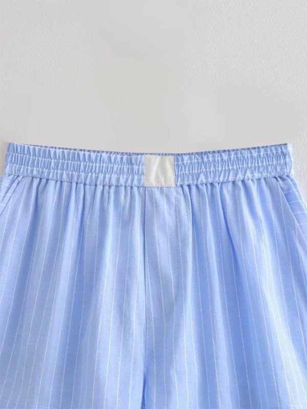 Fashionable Contrast Striped Short Shirt + Shorts Two-Piece Set