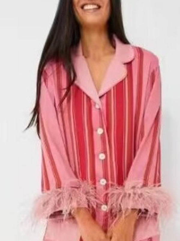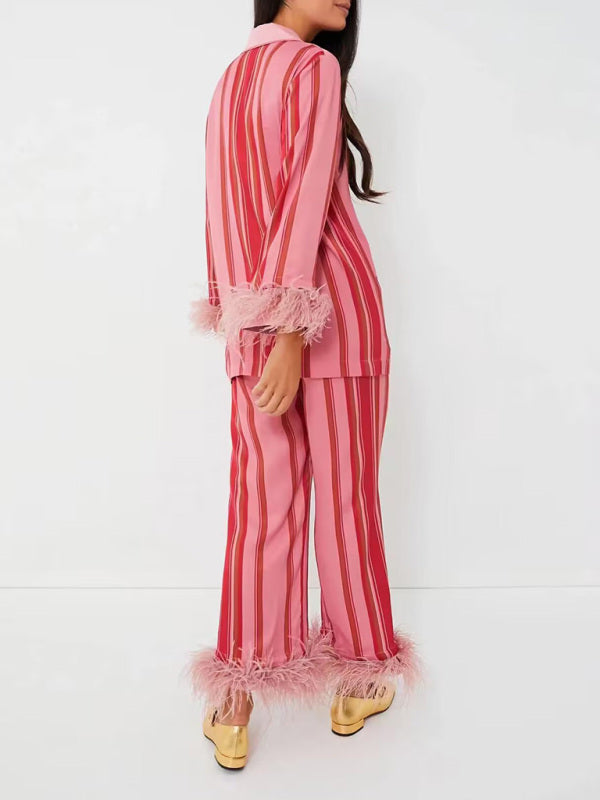 ✨ Trendy Striped Feather Lounge Set Comfy Two-Piece Pajamas for Chic Relaxation ✨