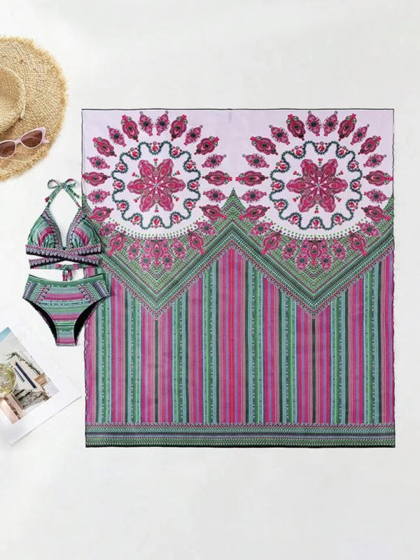 New Bikini Digital Printed Swimsuit Shawl Beach High Waist Swimsuit Three-Piece Set