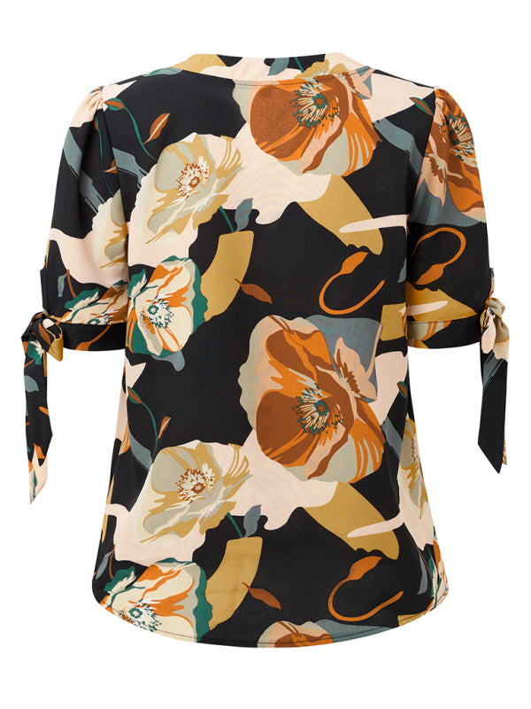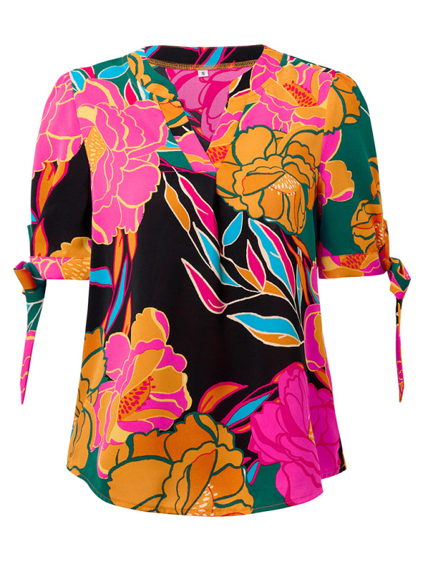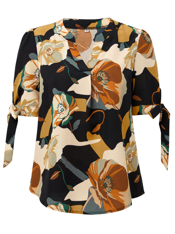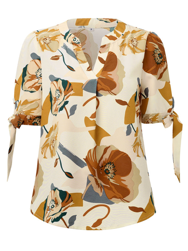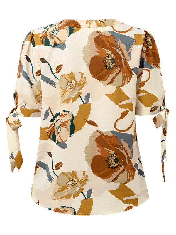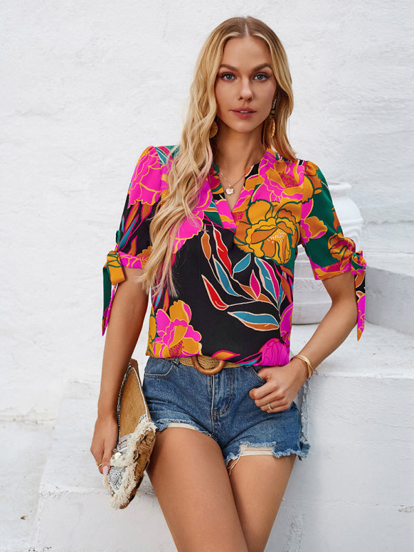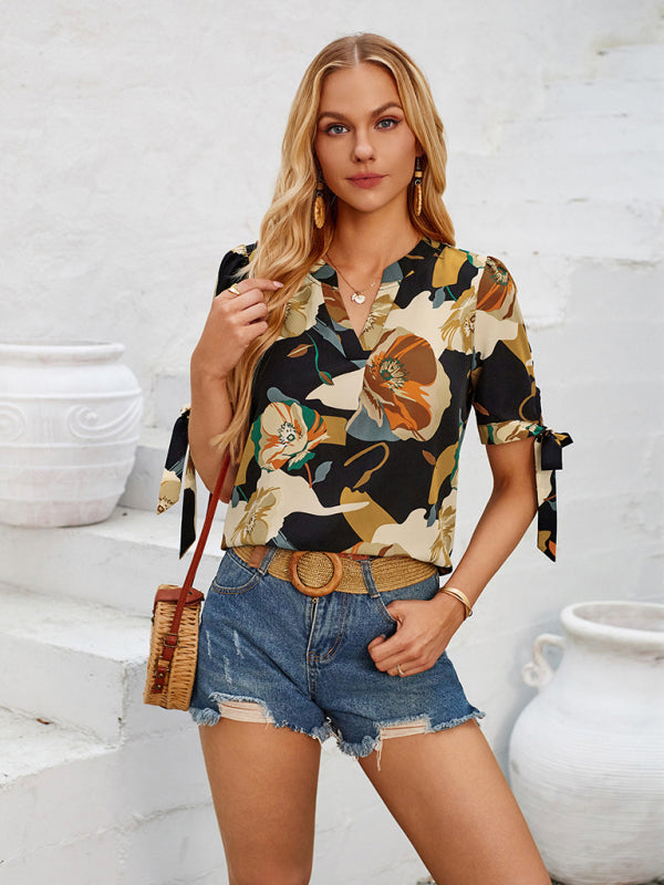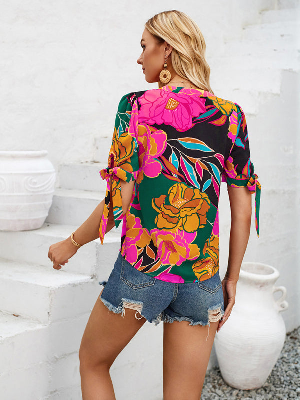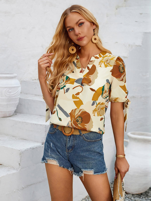 New Fashionable Printed Casual V-Neck Knotted Top – Effortlessly Chic!