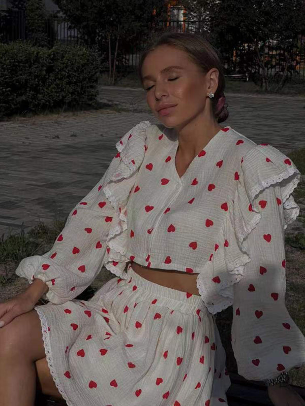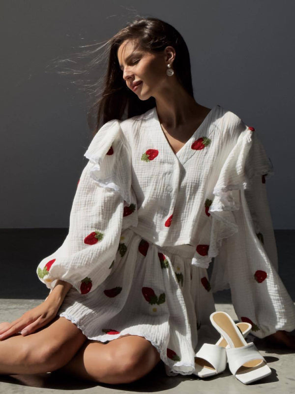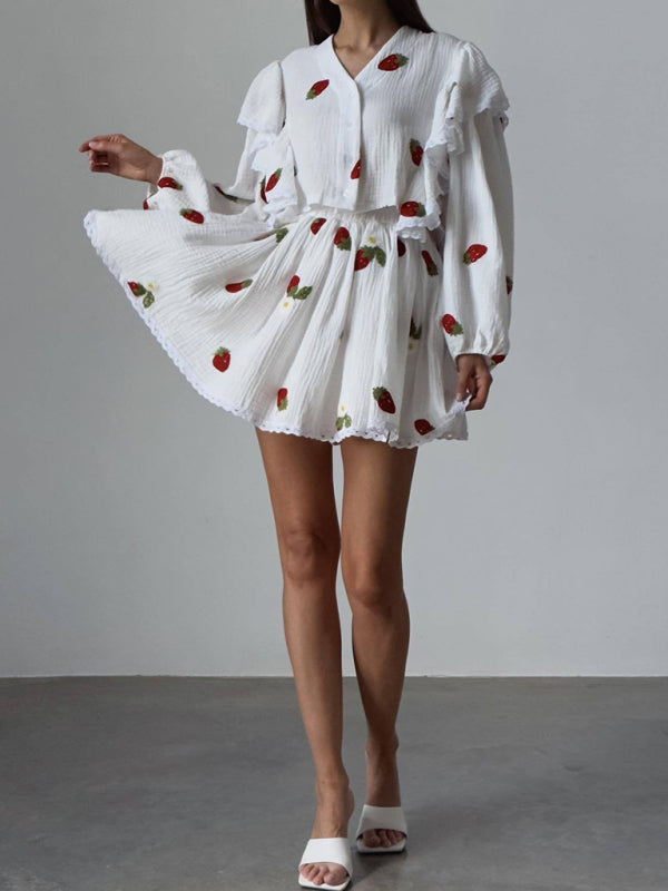 New Women's Ruffled Strawberry Print Skirt Suit β Sweet & Stylish Homewear π