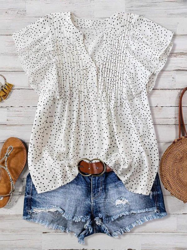Turn heads effortlessly with our Princess Sleeve V-Neck Polka Dot Top—the perfect mix of elegance and playful charm. Featuring delicate pleats, a flattering V-neckline, and airy, statement sleeves, this top is designed to make you feel confident and stylish. Whether you're dressing it up or keeping it casual, this flowy must-have is your new go-to for the season!
