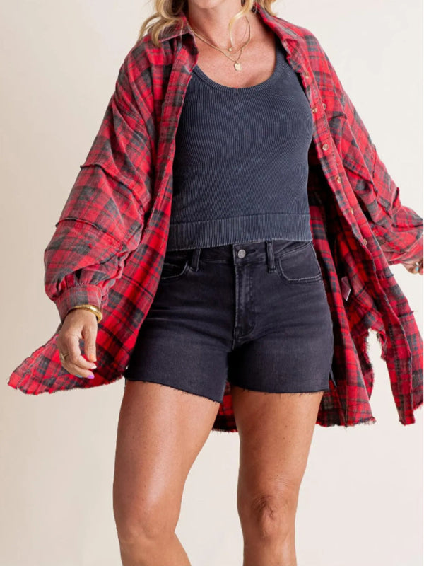 Raw Edge Lantern Sleeve Loose Button Plaid Shirt β Effortlessly Chic, Cozy, & On-Trend
