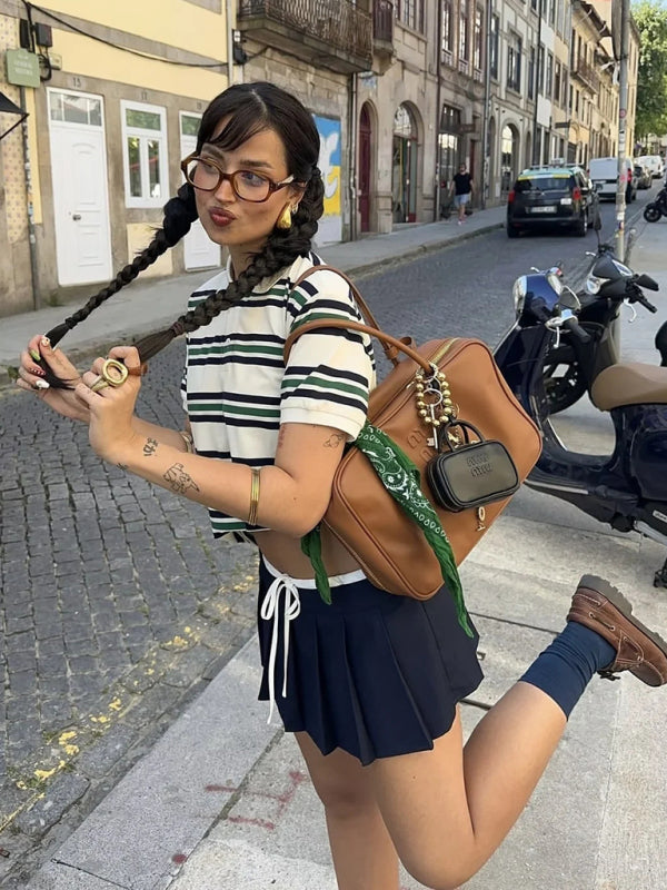 Pair this striped polo tee with high-waisted denim shorts and chunky sneakers for a casual-cool vibe. Want to dress it up? Rock it with a mini skirt and knee-high boots for a flirty, retro-inspired look!