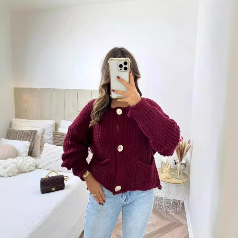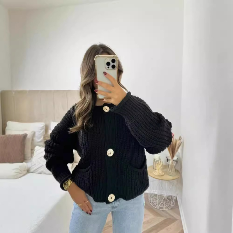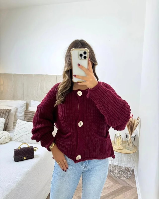 Women's Fashion Chunky Needle Long Sleeve Big Button Sweater