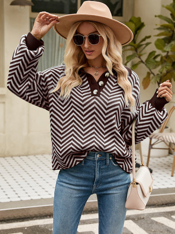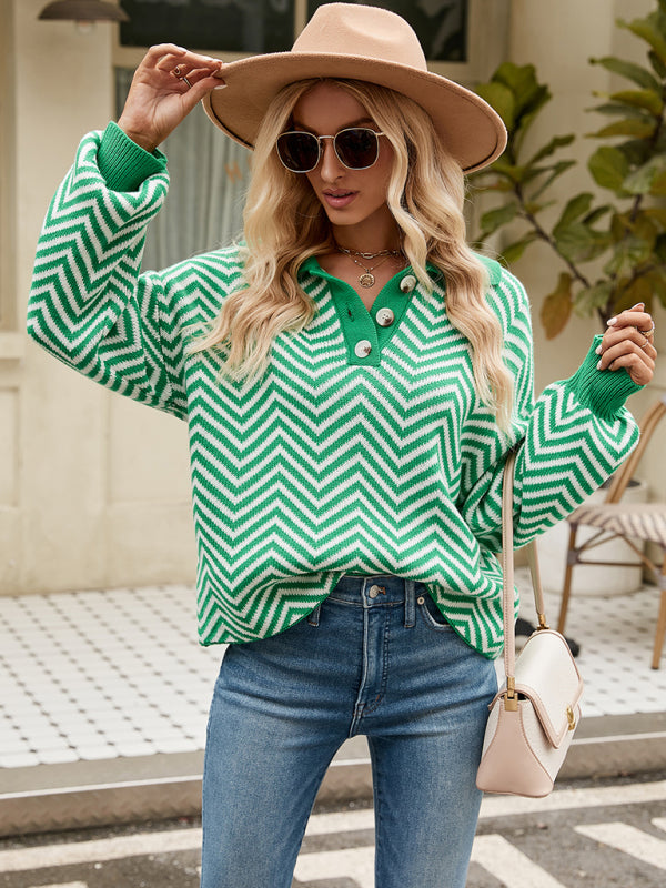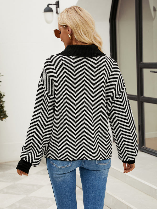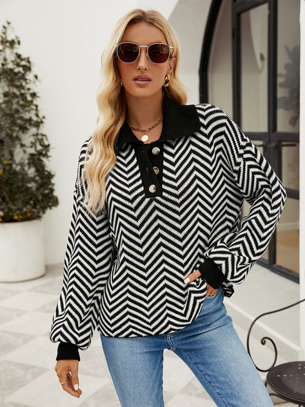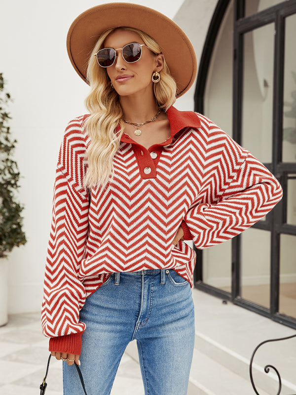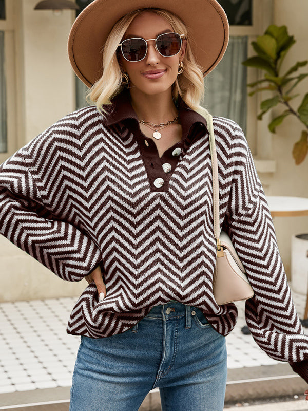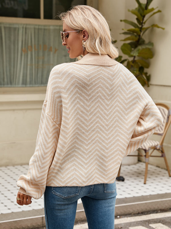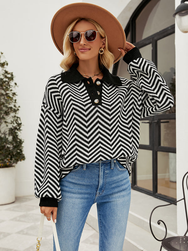 Women's Fashion Striped Knit Long Sleeve Colorblock Lapel Sweater