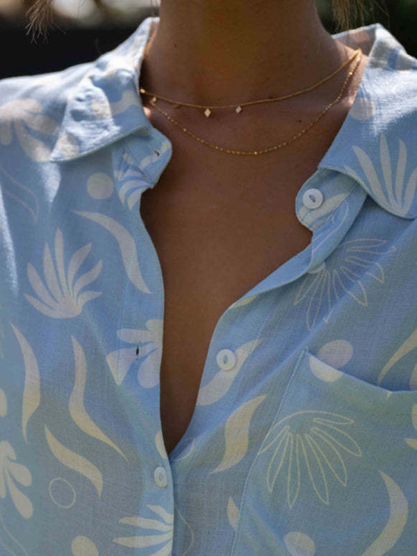 Women's Lapel Printed Sleeve Top & Shorts Two-Piece Set