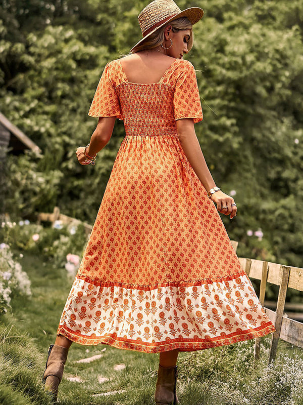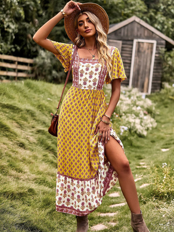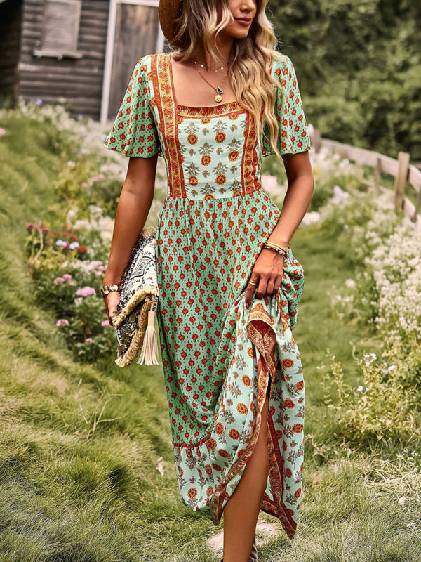 Get ready to turn heads in our Women's Neck Bohemian Short Sleeve Midi Dress – the perfect mix of effortless elegance and free-spirited charm. Designed for the modern muse, this dress features a flattering square neckline, fluttery lotus leaf sleeves, and a breezy high-waist silhouette that moves with you. Whether you're strolling through a sunlit market or heading to brunch with friends, this dress is your go-to for easy, stylish vibes.
