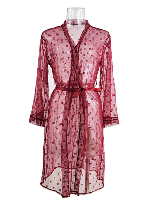Turn up the heat with this irresistibly sexy four-piece lingerie set. Designed for those who love a touch of elegance with a daring edge, this see-through mesh ensemble features a long, flowing coat, a delicate lace bra, sultry underwear, and coordinating bottoms. Whether you're planning a romantic night in or simply treating yourself to luxurious loungewear, this set is the perfect blend of sophistication and seduction.