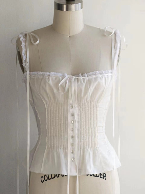 Women's Sexy Pleated Shoulder Low Neck Buttoned Lace Bodycon Top