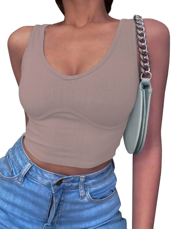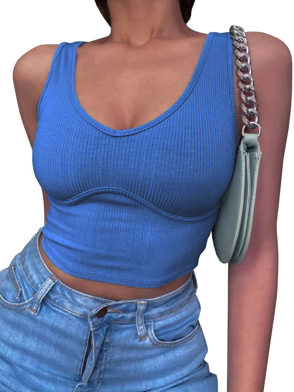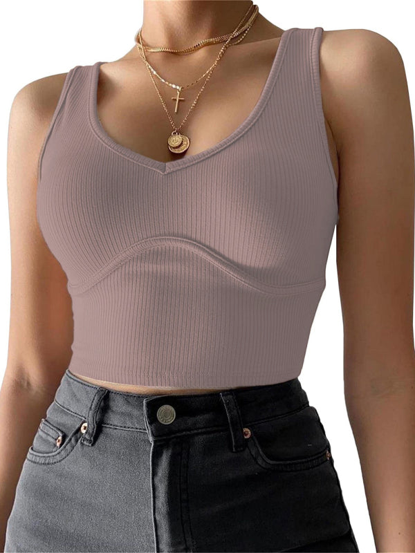 Women's V-Neck Stitching Stretch Solid Color Knit Tank Top