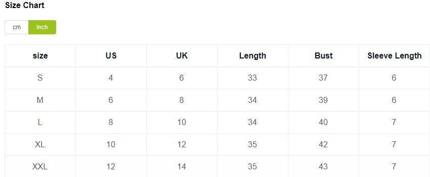 | Size | US | UK | Length (in) | Bust (in) | Sleeve (in) |
